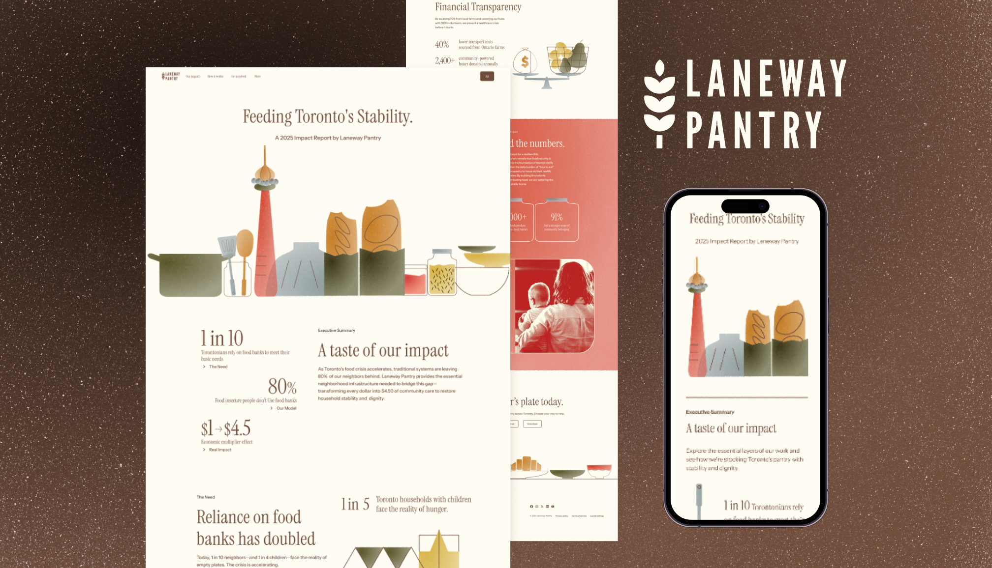 This project transforms a traditional, static PDF impact report into an immersive, mobile-first scrollytelling experience for Laneway Pantry, a Toronto-based social enterprise. By blending “Tactile Geometric Minimalism” with robust data journalism, the report justifies the organization’s structural necessity, helps renew grants, and attracts grocery partners while honoring the dignity of the community it serves.