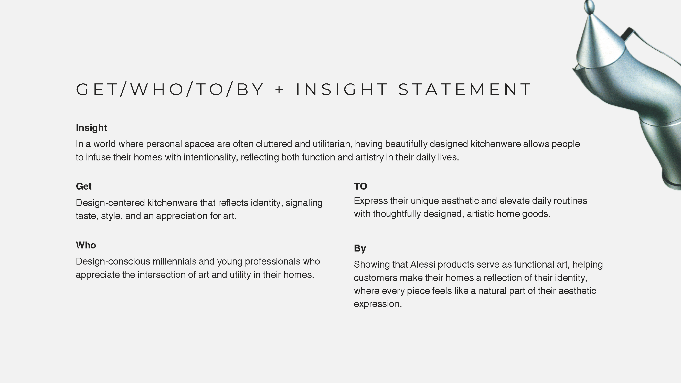 - Educate Canadian consumers about Alessi’s unique blend of art and functionality in kitchenware.