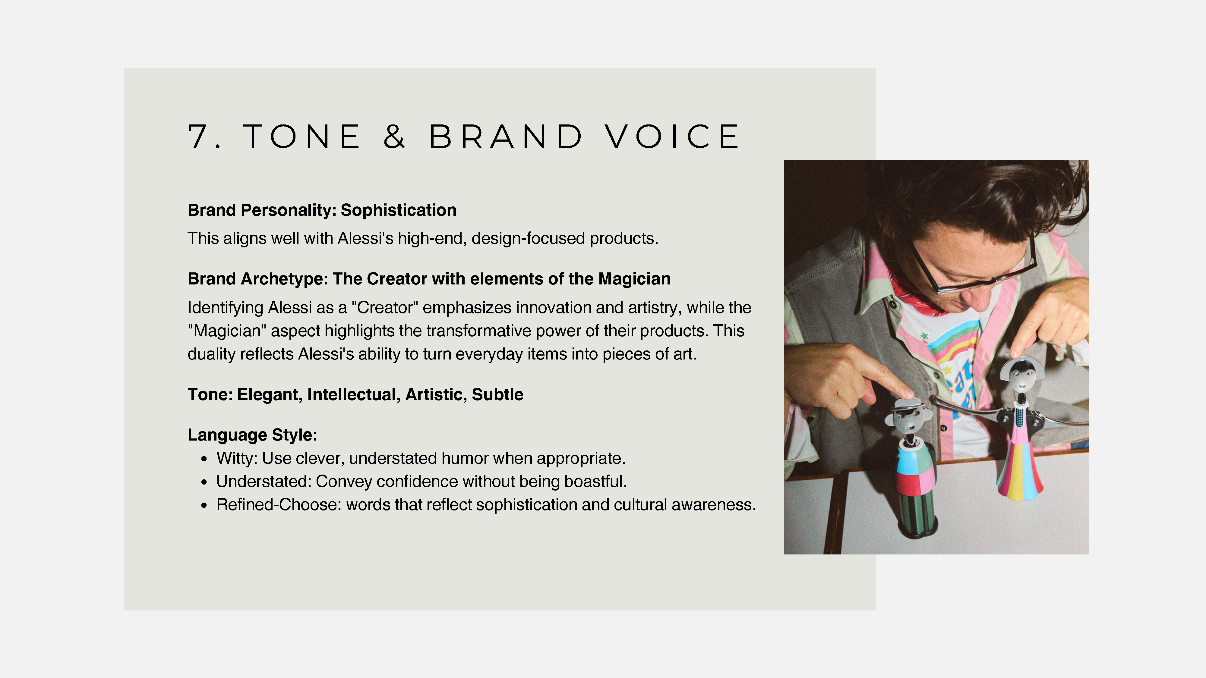 - Tone and Messaging: The tone is elegant, refined, and intellectual, with a touch of witty sophistication. The messaging connects the audience to Alessi’s legacy of design excellence while inviting them to explore the intersection of artistry and functionality in everyday life. The approach builds a strong emotional connection, reinforcing Alessi’s position as a brand for the modern, design-conscious consumer.