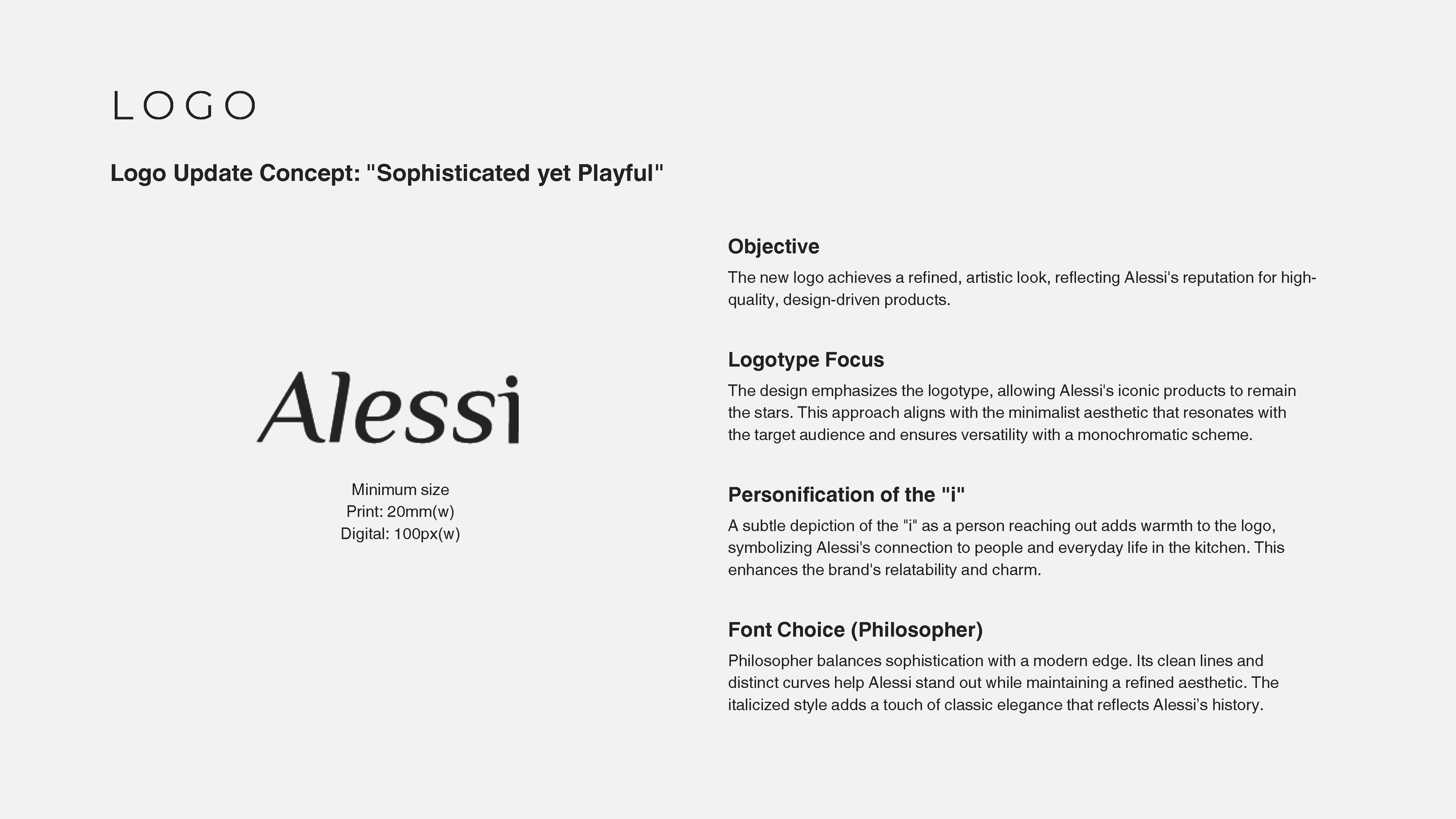 - Logo Redesign: A modern, sophisticated logo that emphasizes Alessi’s Italian craftsmanship while remaining minimalist and versatile for various marketing channels.