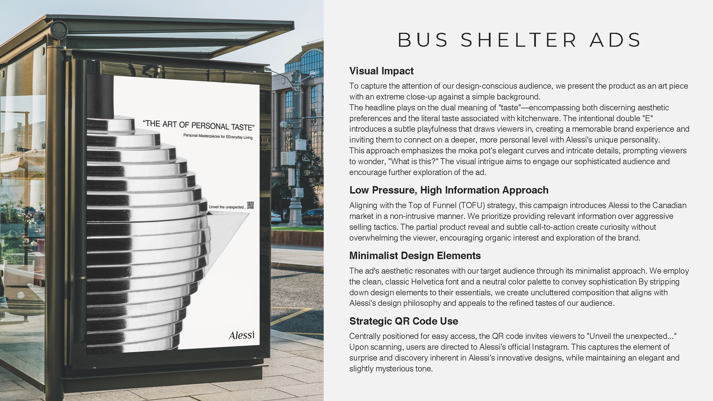 - Bus Shelter Ads: Bold visuals that encapsulate Alessi’s design aesthetic with a QR code integration for deeper engagement via Instagram, showcasing full products and brand stories.